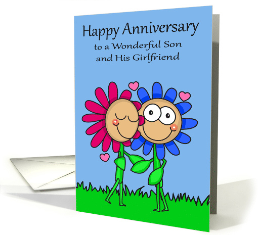 | Artist Notes: | Wish your wonderful son and his girlfriend a Happy Anniversary with a card featuring two colorful flowers embracing with pink hearts against a pretty blue sky with black text. Original design by Laurie Schneider, elements by Scrappin Doodles. FYI In addition to facilitating the reproduction of flowering plants, flowers have long been admired and used by humans to bring beauty to their environment, and also as objects of romance, ritual, religion, medicine and as a source of food. |