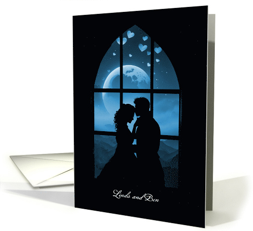 Happy Anniversary card meant to be customized with the couple's name. A romantic image of a man and woman silhouetted by the moonlight in a window.