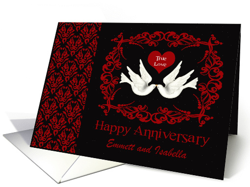 An elegant Happy Anniversary Wedding custom name card emphasizing on two beautiful white doves kissing with a deep red heart overhead. The background is black accentuated with fancy red elements and red text. The front has a text box for the name of the recipients or whatever you choose it's up to you. Design by Laurie Schneider, elements by Digital Designs by Elena