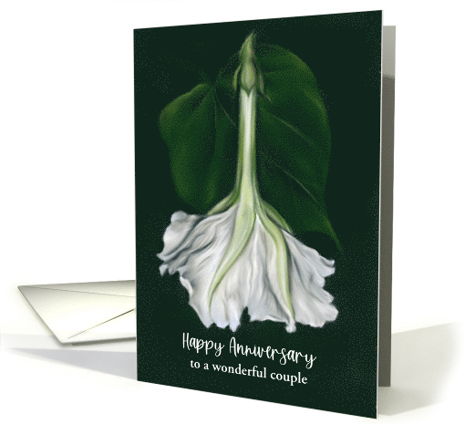 Wish a special couple well on the anniversary of their marriage with this lovely card that is embellished with an elegant white moonflower, evening blossoming relative of the morning glory, as it opens facing downward accented by foliage of a deep green shade.