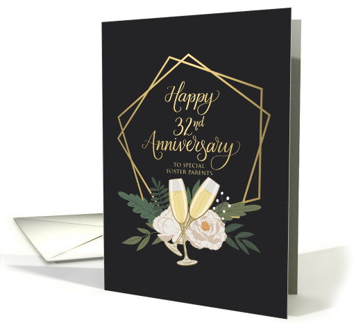 | Artist Notes: | Send your wedding anniversary wishes with this lovely modern boho card illustrated with a faux gold geometric frame decorated with wine glasses, peonies, berries and leaves with the elegant faux gold hand lettered words 'Happy 32nd Anniversary' by Ness to special foster parents. © Ness Nordberg |