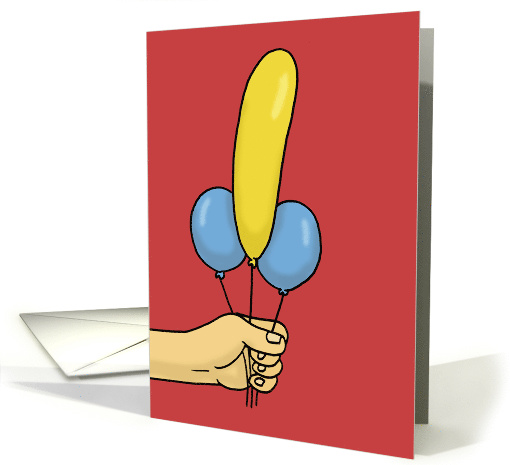 | Artist Notes: | Funny Adult Anniversary Card for spouse, with a cartoon hand holding three suggestive balloons on a red background. There are no words. Inside says: Want to guess your anniversary present? |