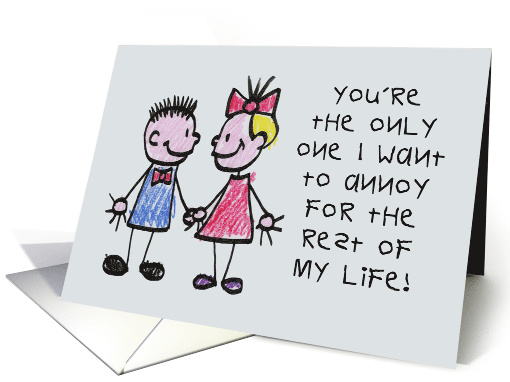 | Artist Notes: | Humorous Anniversary card for spouse, with a cartoon showing a child-like couple, and the words (in a child-like font): You're the only one I want to annoy for the rest of my life! Inside says: Happy Anniversary |