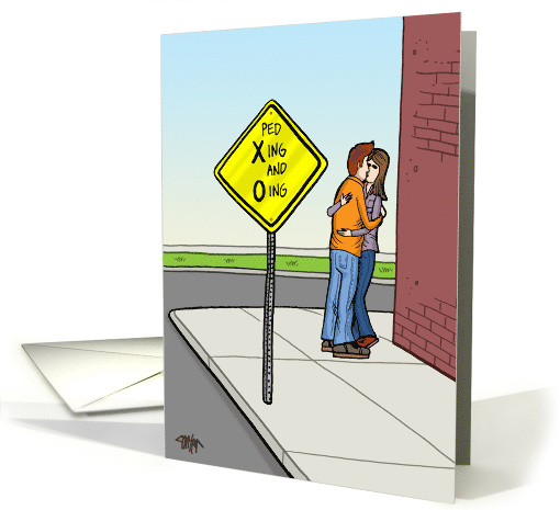 | Artist Notes: | A 'Happy Anniversary' card from Cartertoons Media. This card features a cartoon image of a couple hugging and kissing as they stand on a city sidewalk next to an information sign that reads 'PED X-ing and O-ing.' |