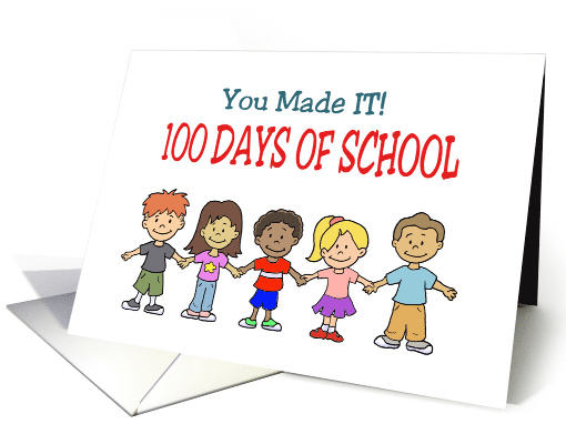 | Artist Notes: | Cute congratulations on 100th day of school card. There is a cartoon showing five elementary school kids holding hands. The words say You Made It! 100 days of school. Inside says, Congratulations! Now you're 100 days smarter! |