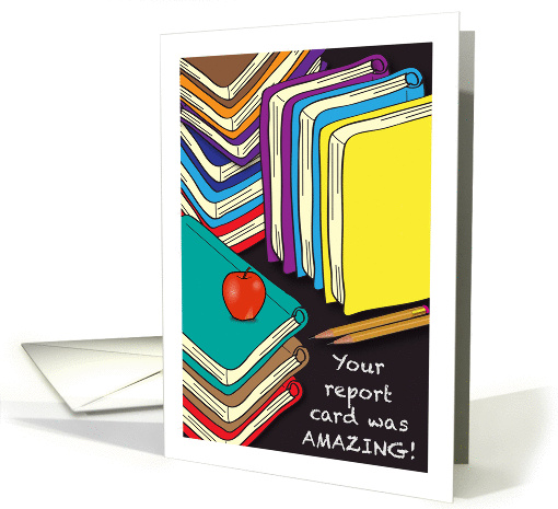 | Artist Notes: | To show that special student how proud you are of his/her report card, give this colorful card! It features my digital design of textbooks on a blackboard. The text is white in a chalk-like typeface. The apple and pencils are courtesy of the Open Clip Art library. ©Gail Pepin |