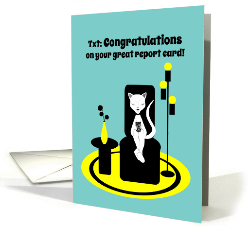 | Artist Notes: | A funny congratulations card design by c.a.teresa featuring a sylistic texting cat in a chair illustration to congratulate friends or family on their great report card grades, while lettting them know they are important enough to receive a real paper greeting card! Inside can be personalized with your own words or custom ordered for any category or different color combinations. Contact me for any help! |