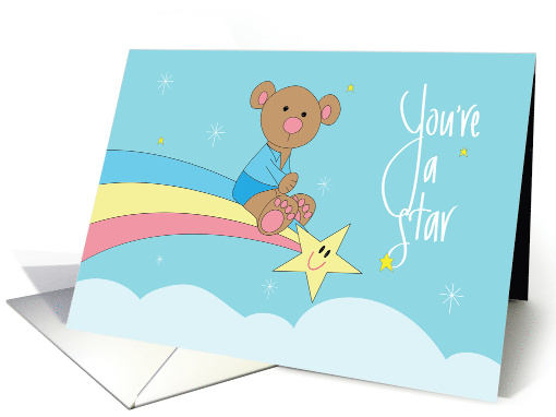 | Artist Notes: | "You're a Star" is the white stacked hand lettering, along this blue card's right side, that you will want to send to a boy who has gotten wonderful grades at school. To the left, an arching rainbow of yellow, pink and blue gives the little bear a place to hitch himself to the smiling yellow star, as they soar through the sky. The inside wording of the card says "Congratulations for your great report card and getting good grades! So proud of you!" |