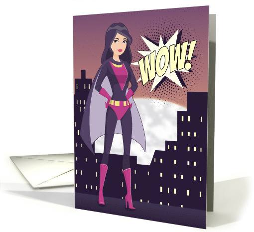 | Artist Notes: | Superhero with purple suit in front of a cityscape and moon with a WOW in comic lettering. Cute and perfect card to give a student congratulating them for a wonderful report card. Design © 2017 Julia Bryant. |