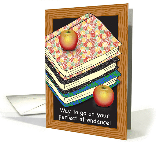 | Artist Notes: | This is a congratulations card for someone having perfect attendance in school, featuring my digital design of colorful books, a blackboard, and apple clip art courtesy of the Open Clip Art Library. ©Gail Pepin. You can change the inside message at checkout, if you wish. |