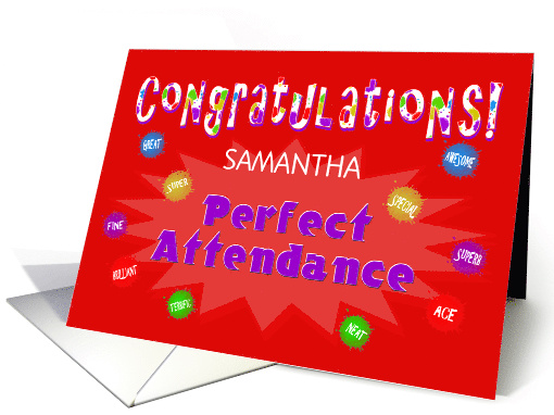 | Artist Notes: | Congratulate a student on perfect attendance with this fun card featuring paint splattered letters and words of praise on a bright red background with an embedded star. Words in paint spots include super, neat, fine awesome, brilliant and more. Personalizing this card with student’s name makes it extra special. |