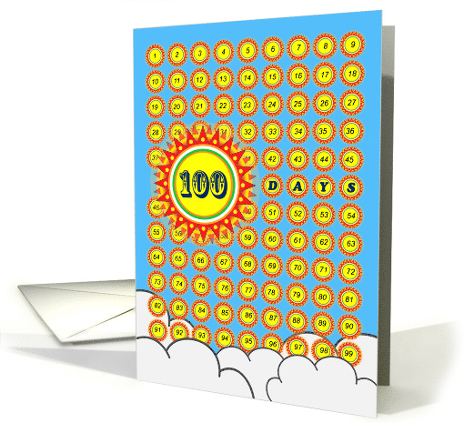 | Artist Notes: | Celebrate a baby boy's first 100 days milestone with this bright and colorful greeting card in shades of blue, yellow, and red. Ninety nine little suns are numbered and a large sun has 100 written on it. Fluffy clouds fill in the bottom of the card. |