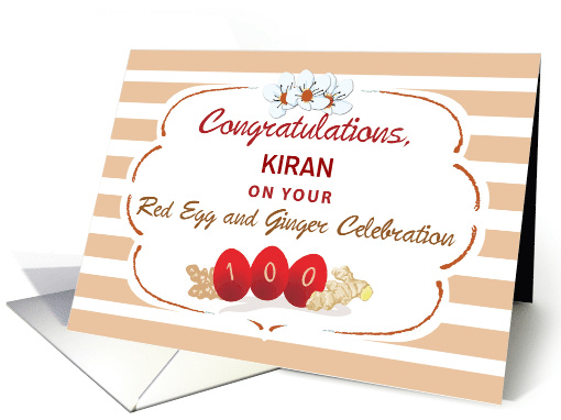 | Artist Notes: | A baby so precious and dear deserves a special congratulations card on their Red Egg and Ginger celebration. Customize with their name, boy or girl, for a truly personalized keepsake card. Light ginger colored stripes add warmth behind the message. 3 red eggs and ginger hold the number 100 for the first 100 days. |