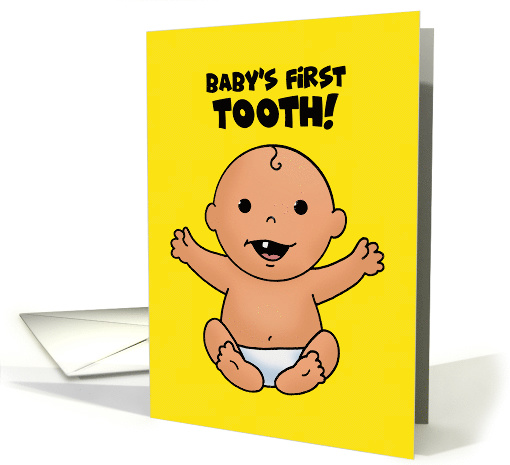 | Artist Notes: | Cute congratulations card for baby getting its first tooth. There's a cute cartoon baby with a big smile and one tooth showing. The words on a yellow background say: Baby's first tooth! Inside says: Congratulations! Soon it will be solid foods! |