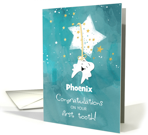 | Artist Notes: | New first tooth? Congratulate the little boy or girl with this customizable card. Change the name to personalize the card. A cute, smiling tooth is hanging from a star! The baby’s first tooth is definitely worth smiling about. |
