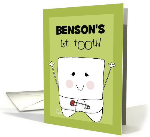| Artist Notes: | ©Christie Black. A tooth wearing a diaper with a large pin holds his arms up as a baby would in this card to congratulate a baby on getting their first baby tooth! Fun way to commemorate this milestone by adding the baby's name to the front of the green background image. |