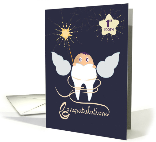 | Artist Notes: | Illustrated milestone congratulations for baby's first tooth. A single tooth with puffy wings in a sky of stars and glints. A baby is peeking out from the tooth. The wand is lit up with stars and flashes. A line resembling a ribbon is loosely wrapped around the tooth curling into the words Congratulations. |