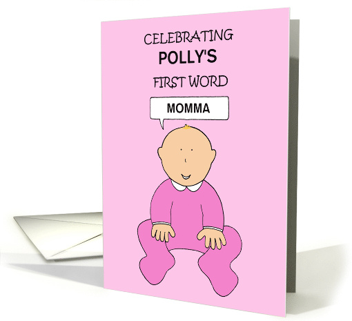 | Artist Notes: | A fun illustration of a baby girl sitting down and wearing a pink outfit. She is saying her first word (which can be customized depending on what the word is). The front of the card can also be customized with the baby's name to make it an extra special momento. |