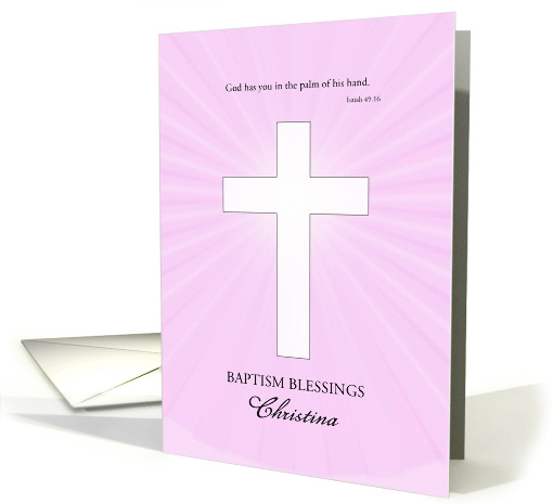| Artist Notes: | A lovely Baptism congratulations card for a young woman. Add her name to make this truly personal.Send your love and best wishes on the day of a baptism with a lovely pink card and a glowing cross. |