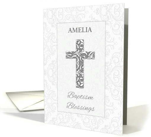 Our customizable "Baptism Blessings" card in silvery gray is an elegant masterpiece suitable for any age. The intricate swirls add a touch of sophistication, making it a timeless keepsake for baby, child, or adult baptisms. The neutral tone ensures versatility for boys or girls, providing a thoughtful and personalized touch to the celebration. The silvery gray palette exudes grace and purity, symbolizing the sacred nature of the baptism ceremony. This card is not just a greeting but a personalized keepsake, allowing you to add the recipient's name for a unique touch. The timeless design and customizable feature make it an ideal choice for creating lasting memories on this joyous occasion.