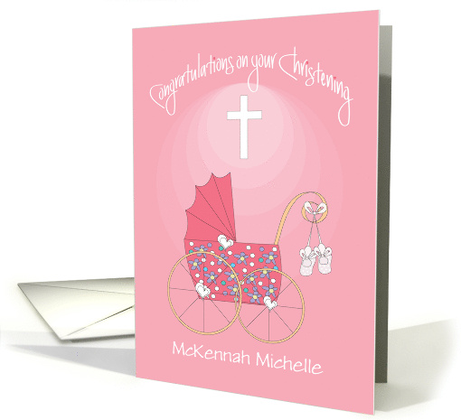 When a new baby girl of a family member or friend is being baptized or christened, this lovely card is the perfect way to congratulate the new little baby girl and her parents. Arching across the top of the pink card are the white hand lettered words of "Congratulations on your Christening", with a white cross just below. At the center of the card is a dark pink floral stroller with huge round wheels. Tied to the curling push bar are a pair of white baby girl shoes. At the very bottom of the card is an area where you personalize her card by typing her name, as you order her christening card. The inside wording of the card says "May God's gentle love protect and guide you in all your ways, little one."