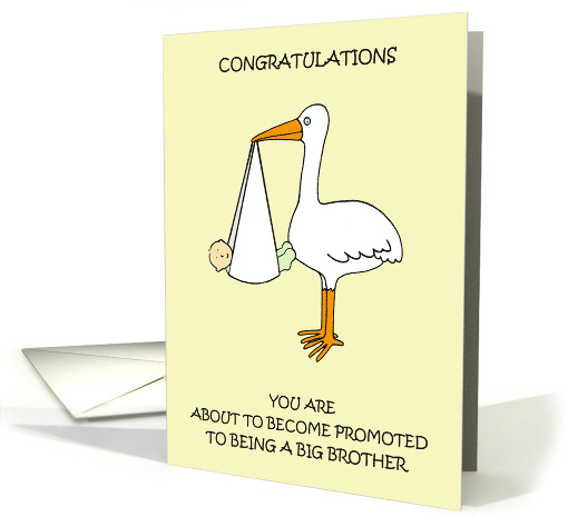 | Artist Notes: | A cartoon of a stork holding a baby in a sheet from it's beak. The image is set against a pale lemon colored background and accompanied by the words 'Congratulations you are about to become promoted to being a big brother'. |