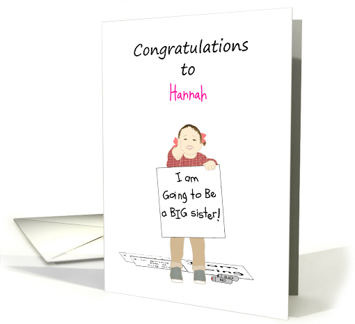 A little girl is going to be a big sister, how special is that! Here we have a soon to be big sister, with her thumb up and holding a sign which reads 'I am going to be a BIG sister!'. On the floor around her are written signs and two marker pens. This design is customizable for her name.
