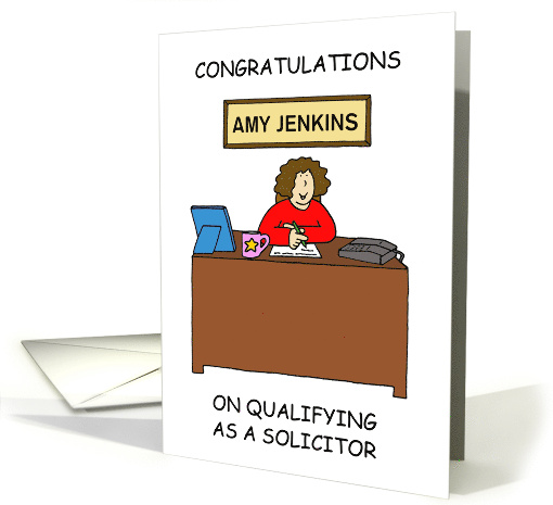 | Artist Notes: | A cartoon of a lady sitting in her office. There is a sign on the wall which can be personalized with any name. The words 'Congratulations on qualifying as a solicitor' accompany the image. |
