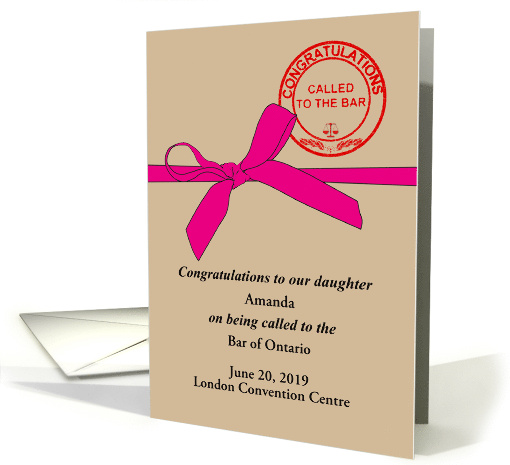 | Artist Notes: | A congratulations card for a daughter who has been called to the Bar. This is a customizable design - you can enter the name of the individual, the date of calling and the name of the courthouse. The design shows a pink ribbon tied round a brown colored folder (the greeting card in this case). On the 'folder' is stamped 'Congratulations Called to the Bar' and features the scales of justice. |