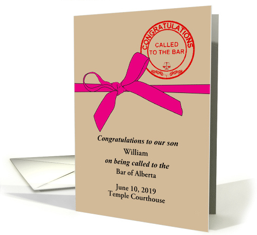 | Artist Notes: | A congratulations card for a son who has been called to the Bar. This is a customizable design - you can enter the name of the individual, the date of calling and the name of the courthouse. The design shows a pink ribbon tied round a brown colored folder (the greeting card in this case). On the 'folder' is stamped 'Congratulations Called to the Bar' and features the scales of justice. |