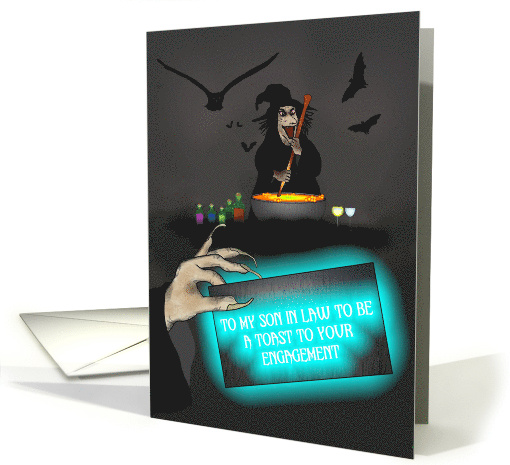 A witch's hand holding an eerie blue glowing note on which is written 'To my son in law to be. A toast to your engagement'. In the background, the mother in law (the witch!) is brewing a celebratory cocktail. Next to her cauldron are bottles of colored potions. In the background, an owl and bats are flying about.