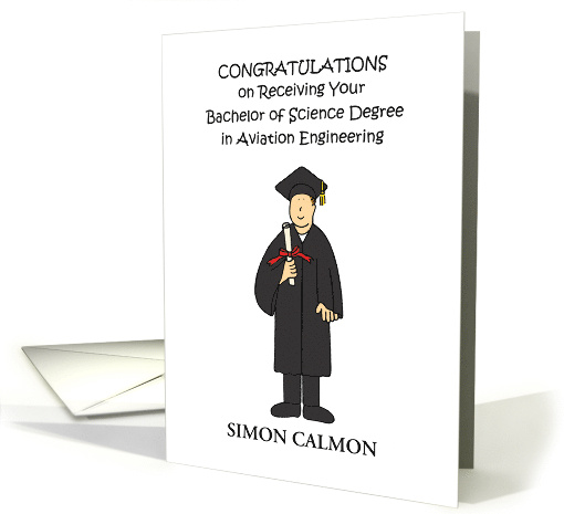 | Artist Notes: | An illustration of a young man wearing a graduation outfit, accompanied by the words 'Congratulations on Receiving Your Bachelor of Science Degree in Aviation Engineering'. The card can be personalised with any name. |