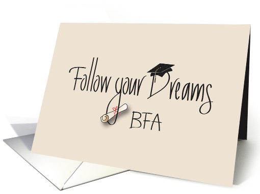 | Artist Notes: | The graduate who will be receiving their Bachelor of Fine Arts Degree will treasure this graduation congratulations card from you, with its hand lettered black wording of "Follow your Dreams". A rolled white diploma is intertwined into one of the wording's letters and a black graduation cap jauntily tops another of the letters, at an angle. "BFA" is hand lettered in all capital letters next to the diploma, at the center of the dark ivory card. The inside wording of the card is "Congratulations on your graduation with a Bachelor of Fine Arts Degree." |