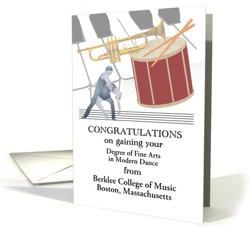 | Artist Notes: | Congratulations on gaining a degree in fine arts. This illustration shows two individuals performing modern dance. To the back we have images in soft focus of a drum and trumpet, and a partial image of piano keys. This design is customizable for the type of degree and name of college. |