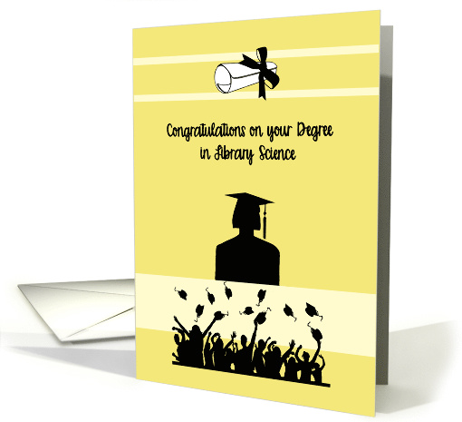 | Artist Notes: | Congratulations on your degree in Library Science, is a beautiful yellow colored design with a silhouette of a female graduate, and a crowd of other graduates throwing their hats in the air. The card also has an illustration of a diploma that is set between two pale yellow borders.. Thanks to the hungryjpeg for some of the elements in the design. |