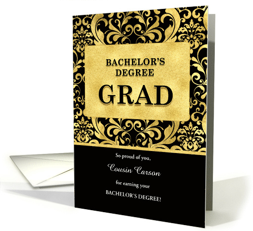 | Artist Notes: | With fully customizable card front text, this classically styled black with artificial gold foil effect creates a formal way for you to offer your personalized congratulations to the graduate in the family - or to anyone - who's earned a Bachelor Degree. |