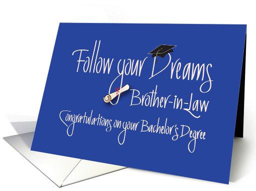 | Artist Notes: | Say Great Job to your Brother in Law when he graduates with his Bachelor's Degree with this lovely hand lettered white and blue card. The card's words are "Follow your Dreams Brother in Law. Congratulations on your Bachelor's Degree" are written in elegant white hand lettering, across a rich cobalt blue card, that is enhanced with two symbols of graduation, a black mortarboard hat and a rolled diploma. An excellent way to express pride in a job well done - this card will be greatly appreciated by your Brother in Law after his hard work in college. |