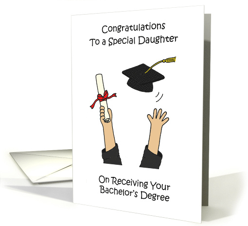 | Artist Notes: | A cartoon of a pair of arms held in the air, with one hand holding a certificate and the other throwing a graduation cap. The image is set against a white background and accompanied by the words 'Congratulations to a special Daughter on receiving your Bachelor's Degree'. |