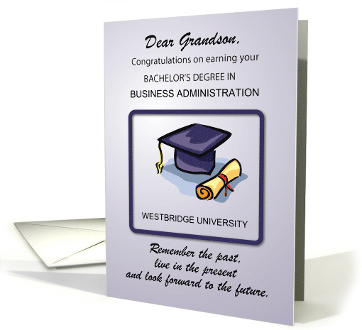 Celebrate a proud academic achievement with this customizable graduation card for your grandson. The design features a graduation cap, rolled diploma, symbolizing education, and effort, set against a soft blue background with bold framing.The front message allows you to personalize the degree and school name, making it perfect for any field of study. A thoughtful sentiment inside encourages and supports your grandson as he moves forward. Whether he's earned a business, music, or engineering degree, this card lets you honor his success with warmth and pride.