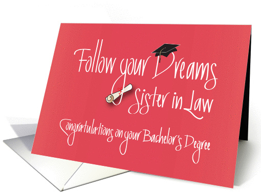 | Artist Notes: | This lovely melon colored Graduation Congratulations card will be greatly appreciated by your Sister in Law after all her hard work at college. She will be thrilled to receive this card congratulating her for receiving her Bachelor's Degree with the touching message "Follow your Dreams Sister in Law. Congratulations on your Bachelor's Degree". The black mortarboard hat and rolled diploma that decorate some of the white letters, on the melon colored background, add to the educational flavor of this beautiful card. |
