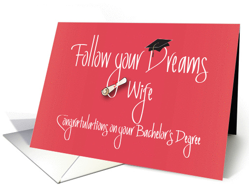 What a time to celebrate! Your Wife is graduating with her Bachelor's Degree! A goal she has had for a long time now - she followed her dreams and made them a reality! Let her know how proud you are of her with this very special card. Its words are beautifully hand lettered, in white, on a richly colored melon background, "Follow your Dreams Wife. Congratulations on your Bachelor's Degree". A tiny black mortarboard and a rolled diploma enhance some of the letters, adding to the educational flair of this card.