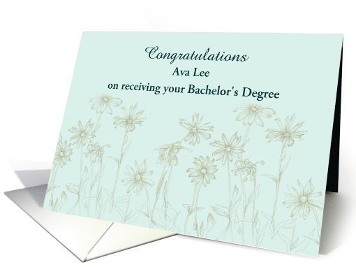 | Artist Notes: | Bachelor's Degree congratulations greeting card decorated with a row of delicate daisy flowers drawn in sepia ink on a mint green background. Customize the card with graduates name and special message on the inside. |