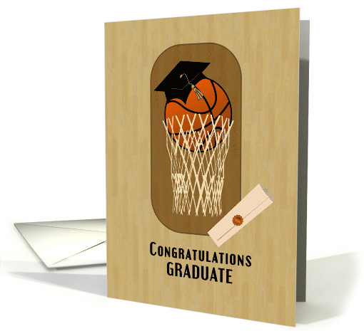 | Artist Notes: | Illustrated congratulations card. A basketball sports themed card for a graduate. A basketball court simulated maple wood flooring. In the center is a basketball going into the netting. The ball is wearing a graduating hat or cap. A rolled up diploma or degree with a seal is at the bottom. Appropriate for any basketball enthusiast who has obtained either a degree or diploma. |