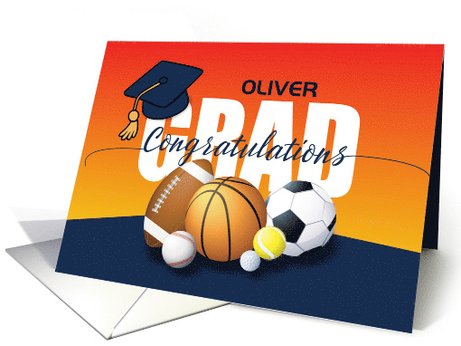 | Artist Notes: | For the multi-sport athlete, this customized graduation card is the ultimate tribute! With “GRAD” in bold white letters over a collection of sports symbols, it celebrates every game, practice, and victory that led to this achievement. Featuring “Congratulations” across the front and a space for their name, this card is the perfect way to recognize an athlete’s drive, commitment, and success. |