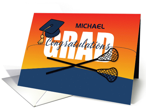 | Artist Notes: | A winning way to honor a lacrosse player’s graduation! Featuring bold “GRAD” lettering with crossed lacrosse sticks, this card celebrates the hard work, discipline, and passion that brought them to this moment. “Congratulations” is written across the design, and with a customizable name, this card is a standout way to celebrate a student-athlete’s achievement. |