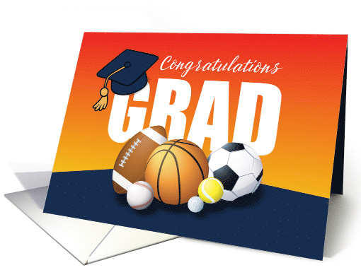 For the all-around student athlete, this graduation card covers it all! With a bold navy blue background and a vibrant gradient of yellow to orange-red, the design features “GRAD” in striking white letters, set above a mix of sports symbols representing multiple athletic passions. A navy blue graduation cap with a golden-yellow tassel ties it all together. Whether they play football, basketball, soccer, or baseball, this card is the perfect way to celebrate their dedication, perseverance, and winning spirit on this milestone achievement!