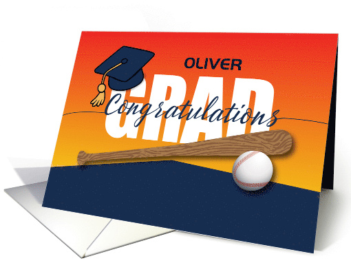 Artist Notes: | Celebrate the student-athlete who has knocked their goals out of the park with this personalized baseball-themed graduation card! Featuring bold “GRAD” lettering over a baseball, this design includes “Congratulations” across the front and a customizable name to make it extra special. Perfect for a hardworking player who has stayed focused, trained hard, and is now rounding the bases toward the future. |
