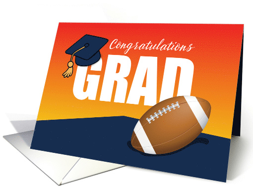 | Artist Notes: | Celebrate the graduate with this bold and dynamic football-themed card. Set against a navy blue background with a striking gradient of yellow to orange-red at the top, the design features the word "GRAD" in large white letters, angled over a football. A navy blue graduation cap with a golden-yellow tassel adds the perfect finishing touch. With a modern and sporty feel, this card is ideal for football players, fans, and athletes who have tackled challenges and stayed focused on their goals. A great way to honor their hard work and dedication on this milestone achievement! |