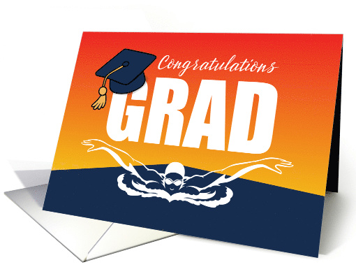 | Artist Notes: | Honor the achievement of a swimming graduate who has gone the distance with this sporty card! Set against a navy blue background with a warm gradient, the design features “GRAD” in bold white letters angled over a swimming cap and goggles. A navy blue graduation cap with a golden-yellow tassel adds the finishing touch, making this card the perfect way to celebrate student-athletes who have powered through every lap and reached their graduation goals. |