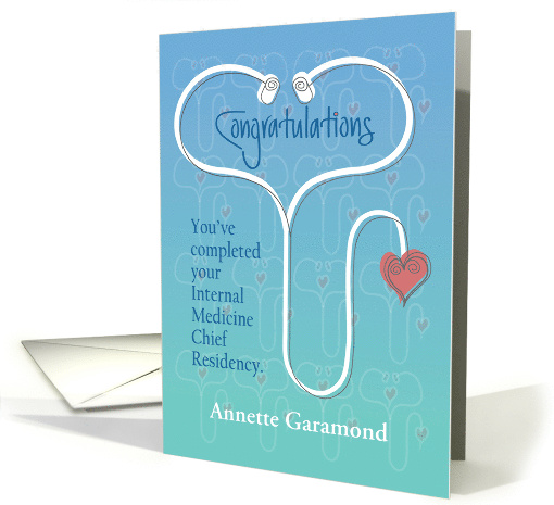 This dynamic stethoscope-filled card will congratulate the new graduate of the Chief Residency Program at your school or medical facility, or the friend or family member, who has just completed their Internal Medicine Chief Residency. The hand lettered wording "Congratulations" is written inside the heart-shaped top of a large, white stethoscope that sweeps down and up, the height of the card, to end with a red heart. Additional words, along the left side of the stethoscope say "You've completed your Internal Medicine Chief Residency". The bottom of the card provides an area for you to enter the graduate's name, as you order their card, just follow the prompts to type in their name, as you order their card. The inside wording says "Congratulations and best wishes as you continue pursuing your career in Internal Medicine."